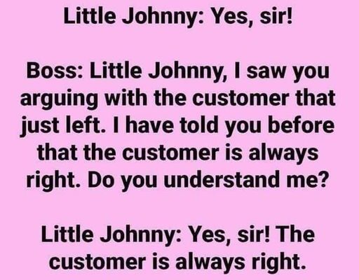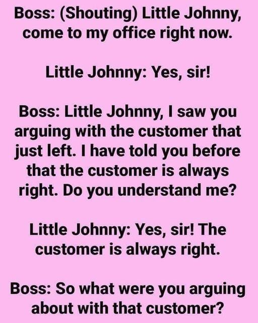 “Johnny, I noticed you arguing with that customer who just left. I’ve told you before, and I’ll tell you again—the customer is always right. Do you understand that?”
