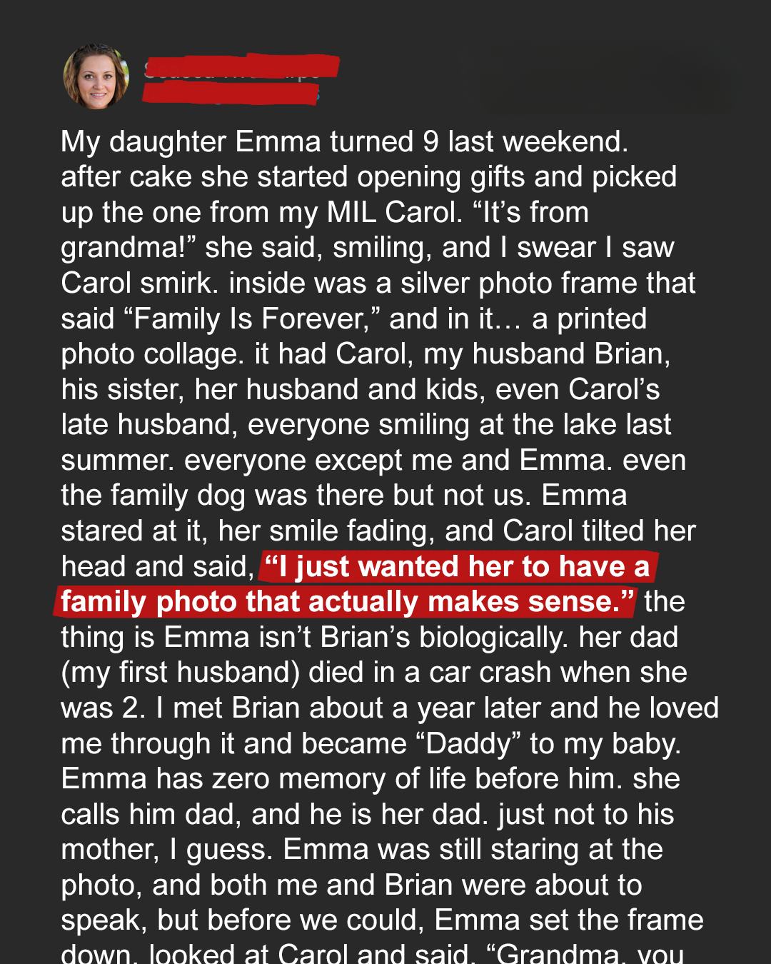 My mind raced. NO. It couldn’t be. I gripped the album tighter. This was sick. This was deranged. Why would she do this? Give my daughter a photo album where her own family unit was symbolically… dead?