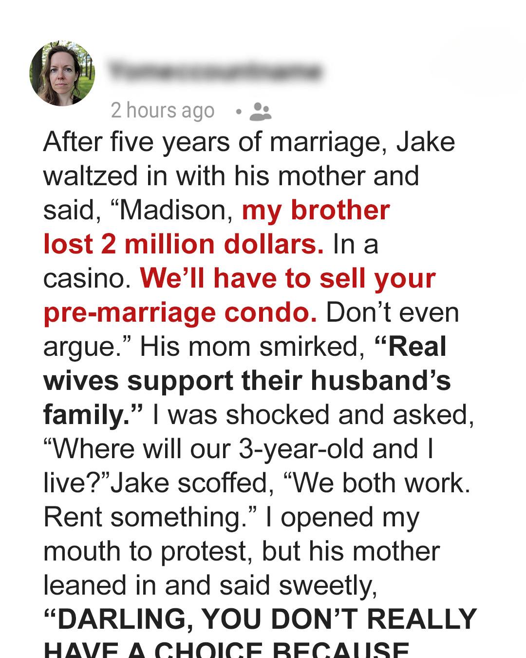 My breath caught in my throat. Two million dollars. It was an astronomical figure, a sum that felt abstract, impossible. My mind raced, trying to grasp the magnitude. “What… what are you saying?” I whispered, a chill creeping up my spine. He looked at me, his eyes pleading, desperate. “He needs help. Real help. They’ll lose everything. Their house, their savings… everything.” He paused, took a deep breath, and then dropped the bombshell, the one I knew was coming even as I prayed it wouldn’t. “He needs a loan. A big one. And… and his mother, she thinks… she thinks you should sell your condo.”