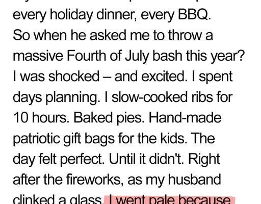 The 4th of July arrived, bright and sunny, mocking my inner turmoil. Our house filled with family, just as he’d wanted. The smell of barbecue filled the air. Laughter, fireworks already popping in the distance. My parents hugged me, telling me how wonderful it was that he was finally embracing family time. Each compliment felt like a fresh stab.
