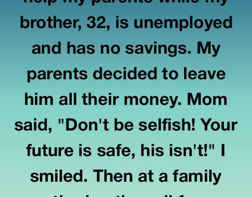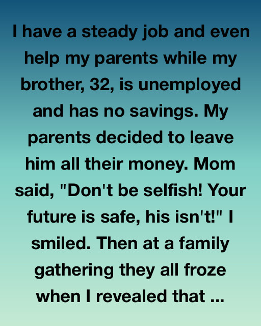 I have a steady job and even help my parents while my brother, 32, is unemployed and has no savings. My parents decided to leave him all their money. Mom said, “Don’t be selfish!Your future is safe, his isn’t!” I smiled. Then at a family gathering they all froze when I revealed that I had just bought a house. I didn’t plan to drop the news like a bomb.