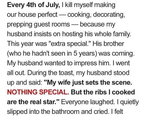 I poured my soul into that 4th of July party. Every string of fairy lights, every perfectly grilled burger, every carefully curated song on the playlist… it was all me. Days blurred into nights, fueled by coffee and a desperate need for perfection. And when the day finally arrived, when our backyard transformed into a shimmering wonderland, when laughter filled the air and the smell of barbecue mingled with sparkler smoke, he just waltzed around, drink in hand, accepting every single compliment as if he’d conjured it all with a flick of his wrist. He took all the credit. And I, stupid, silent me, let him.