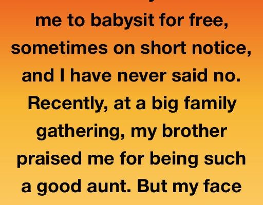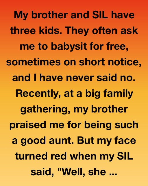 My brother and SIL have three kids. They often ask me to babysit for free, sometimes on short notice, and I have never said no. Recently, at a big family gathering, my brother praised me for being such a good aunt.