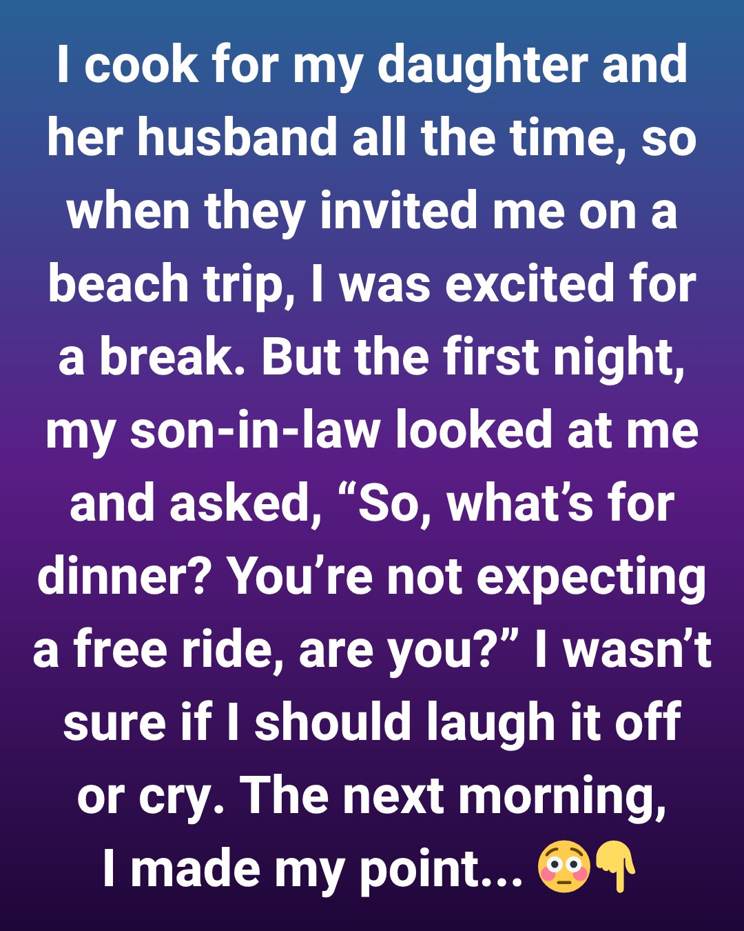 But the ‘suggestions’ didn’t stop. They intensified. Could I bake some of my famous cookies for the drive? Did I mind picking up groceries on the way, since I knew all the best local produce? Could I just whip up a quick breakfast for everyone each morning? By the time we arrived, my unspoken role was clear: I wasn’t a guest. I was the hired help, without the pay. My daughter looked uncomfortable, glancing at me apologetically, but never saying a word to him. She just offered me little smiles and pats on the arm.