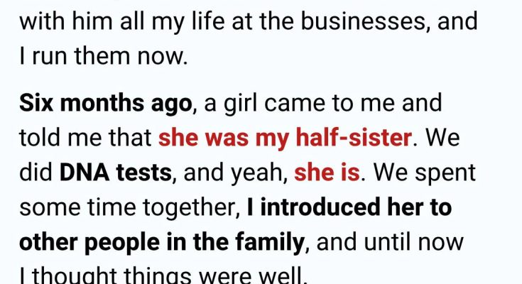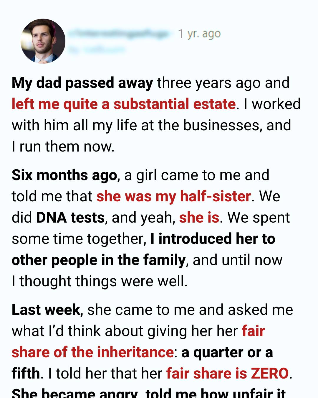 She showed up at the house a week after the funeral. Just… appeared. Like a ghost from a past we’d all tried to bury. My half-sister. And she had the audacity, the absolute gall, to demand a share of our dad’s inheritance.I told her she deserves nothing.