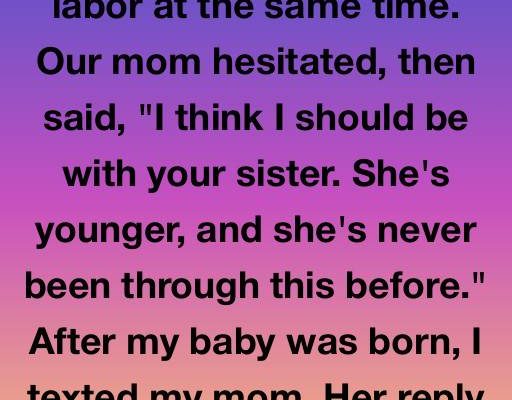 My sister and I went into labor at the same time. Our mom hesitated, then said, “I think I should be with your sister. She’s younger, and she’s never been through this before.” After my baby was born, I texted my mom.